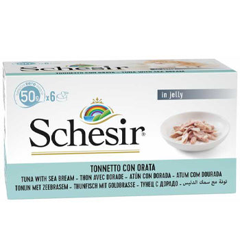 A Schesir recipe based on real fillets of delicious tuna , paired with sea bream, a fish known for its lean and tasty meats. The ingredients are prepared in jelly , to satisfy the taste of cats who prefer the taste of the sea , but with a more compact consistency in the bowl. The practical multipack with portions of 50 g , specially made for cats who eat small quantities of food , is the ideal solution to avoid waste !