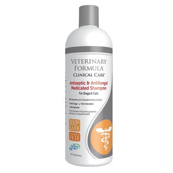 Veterinary Formula Clinical Care Antiseptic & Antifungal Shampoo is scientifically formulated with benzethonium chloride, an anti-bacterial agent, as well as ketoconazole, an anti-fungal, to help relieve bacterial and yeast infections. Lanolin and aloe vera are added to help heal and soothe sensitive skin.